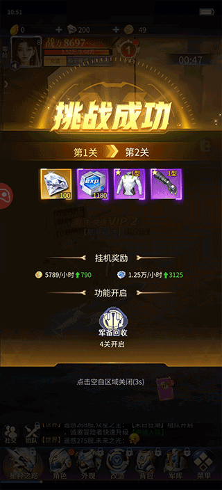 5、完成关卡挑战后,领取挂机奖励,积累资源;随着关卡推进与等级提升,开启如军备回收等新功能,拓展游戏玩法。