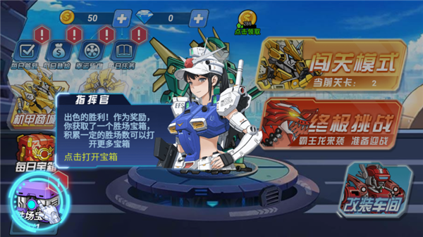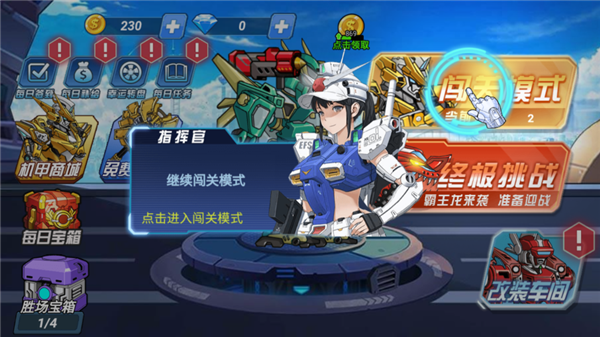 4、点击“闯关模式”,闯关模式是这款游戏主要战场,在其中击败机甲可以获得更强的部件,让你的机甲站长变得更强。