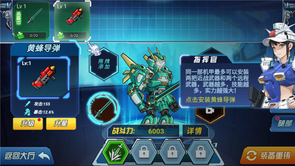 14、点击安装黄蜂导弹,因为同一部机甲最多可以安装两把近战武器和两个远程武器,武器越多,技能越多,实力几越强。