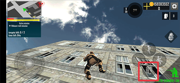 2、进入游戏后,左边轮盘操控角色的移动,右边为发射、跳跃、绳索