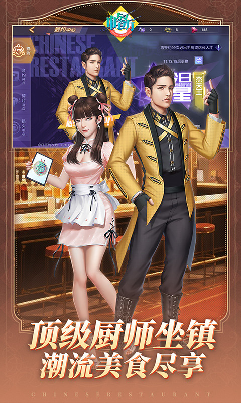 中餐厅是一款根据热门同名综艺打造的餐厅经营游戏,是国内首款主打明星餐饮的模拟经营游戏,游戏具有q版可爱的画风和休闲的玩法模式,配色也是十分舒服的。在游戏中,玩家化身为中餐厅的店长进行餐厅经营,和各位明星合伙人一起收集各式菜谱,因此就需要通过制定极具中华特色的美食菜谱,不断优化经营流程,提升餐饮服务,让每一位前来的顾客感受中华美食。同时还能参加“厨王争霸赛”为您的餐厅赢取至高荣誉,比最终的目标是在餐厅不断经营发展壮大之后,把中餐厅开遍世界各个角落,弘扬中华美食文化,为饥肠辘辘的市民们带来美味可口的饭菜。