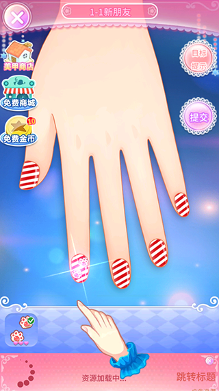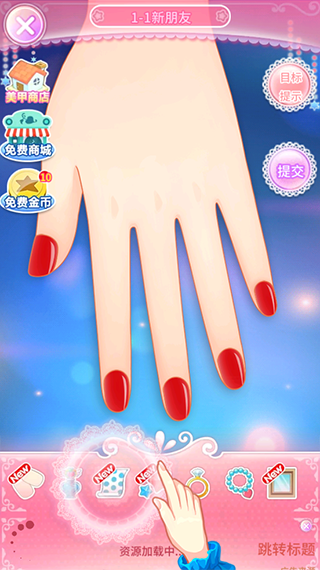 3、“魔法美甲2”中,装扮主要包括“指甲”、“指甲油”、“花纹贴”、“钻饰”、“戒指”、“腕饰”以及“背景”共7个部分,装扮顺序与生活中的真实的美甲一直。其中“指甲”、“指甲油”与“花纹贴”一代美甲差别不大,我们只需要按着相应的目标,换上合适的形状与颜色就行了。