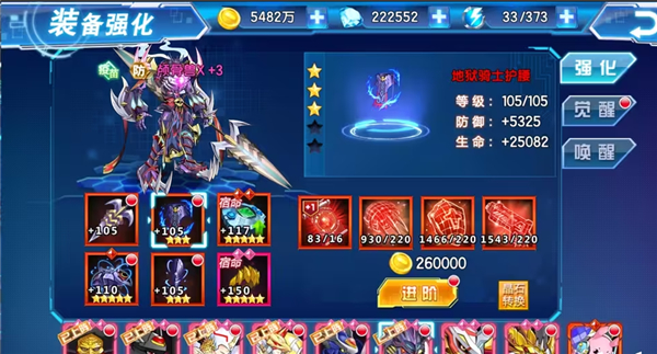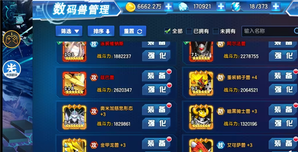 6、装备,消耗类似于技能,一般升到95级即可。95级即可把装备唤醒提升到满级,我是升到105级/110级,因为加的战力实在是不多。极限培养的数码兽可以继续升级。
