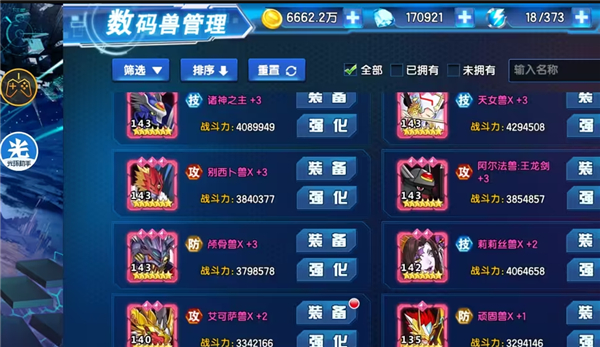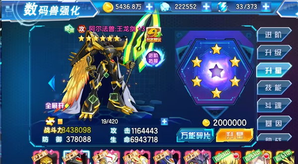 4、升星,这个很有讲究。不是有多少升多少。星数对平民来说,六星就已经是上限了,七星是极限玩家去升的,六星到七星只加20000战力,甚至不如升阶加的多。七星之后用碎片点潜能,一次500-1000,这也是极限玩家的玩法了。平民要明确自己升星的目的,是单纯为了看六星大招有多炫酷还是为了基因玩法还是为了队伍看起来顺眼。一般17资质数码兽必须五星才可以开启基因2,六星才可以开启基因4、6。而且升星的万能碎片是无法重生返还的,一定要慎重又慎重。