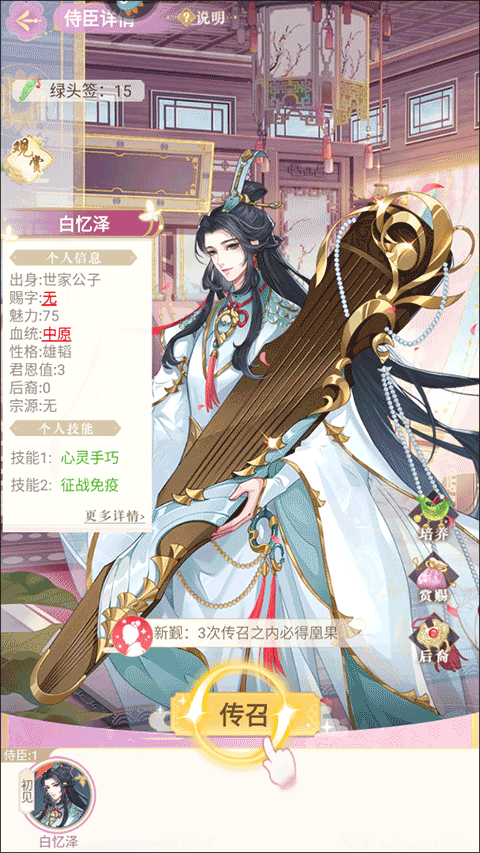 【招贤纳士 增强国力】 人才是一个国家发展的重要基石,在上凰当然也不例外。对招募来的贤才进行演礼教学,可以使他们了解上凰的礼仪,养成迥异的性格,从而获得不同的战斗/生活技能。礼成的贤才可以出仕到别国为官,加深国与国之间的联系,建立友好关系,当然若您心有不舍,也可以让他们留下来辅佐自己,又或是和出征的侍从们一起接受历练也都是极好的。