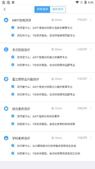 例如,进入做测评,能够进行学科、性格、职业、综合素养进行测评;
