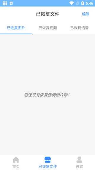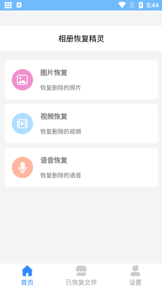 1、打开应用后在首页就能够看见有三个可恢复的功能,分别是图片恢复、视频恢复、语音恢复,选择需要的功能进行恢复即可