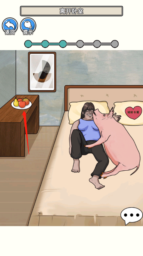 7、想要离开房间就向右滑屏幕,找到水果并点击它,让妈妈先吃水果,随后查看房间右边点击电话,妈妈就会想要去上厕所了。