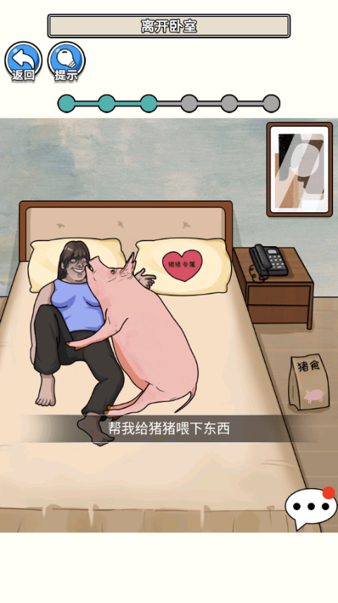 6、来到妈妈的房间,她好反常,叫你给猪喂食,这个时候你要想办法离开房间,先点击右下角的消息查看规则吧。