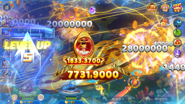 3、玩家需通过点击屏幕来捕鱼,而且炮台可以升级;