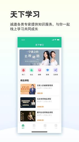 天下学习板块有国内品牌营销管理战略策划专家录制的精品视频课程,数百位名师专家定期分享有价值的学习心得和感悟,用户可通过观看短视频、直播等方式免费学习。