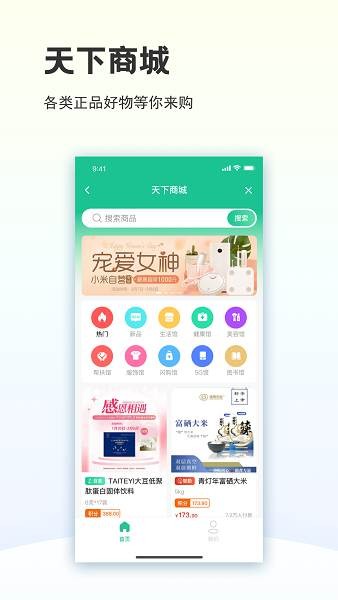 打开首页的“天下商城”,可依据积分进行产品兑换。