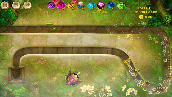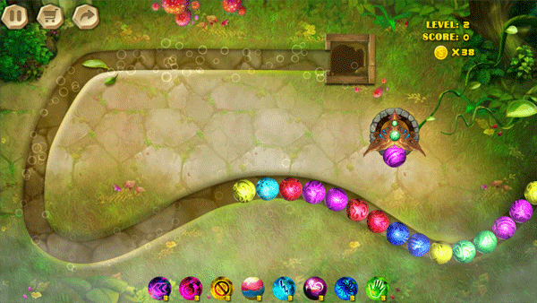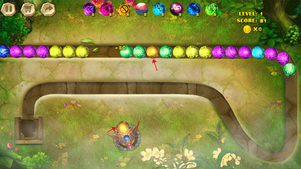1、简单的点击屏幕发射,沿着轨道去匹配三种或三种以上相同颜色的球。