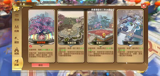 开树:玩家帮会每晚将会进行开树活动,时间限制10分钟,玩家会被自动传送至帮会副本,同时每5秒钟自动获得经验以及灵力,开树时系统自动进行答题,答对同样获得灵力、经验奖励。