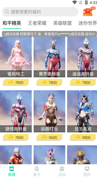 2、在商城这里,用户可以通过迷你点兑换稀有皮肤,支持和平精英、玩着荣耀、英雄联盟、迷你世界、摩尔庄园、奥特曼传奇英雄等多种热门游戏;