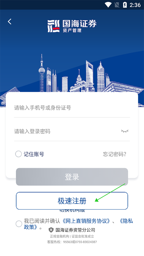 1、登录账户:首先登录用户在国海证券注册开通的基金账户(通常就是资金账号,不仅可以用户投资基金,股票、期货都可以),没有账号的用户可以在登录页面下选择【极速开户】点击