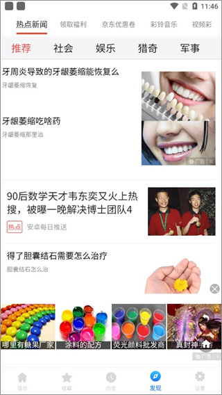 4、在“发现”中也是可以查看:推荐、社会、娱乐、猎奇、军事等。