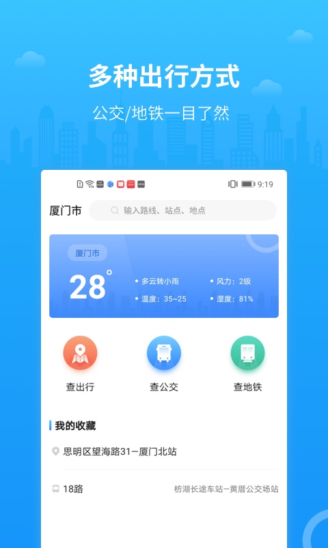 2、进入软件之后,在首页可以进行:查出行、查公交、查地铁。