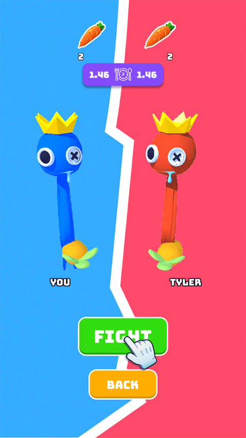1、进入到游戏当中我们将扮演一名什么都吃的彩虹朋友,通过不断的吃食物从而增加体重更好的赚取钞票。
