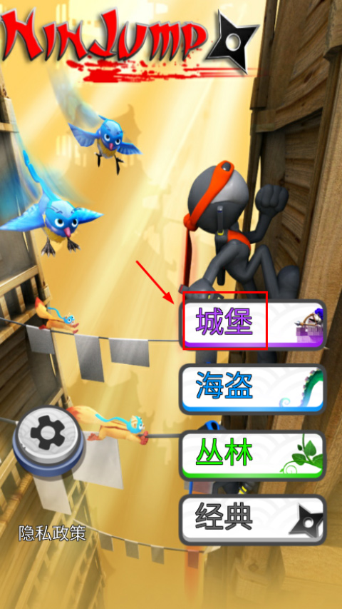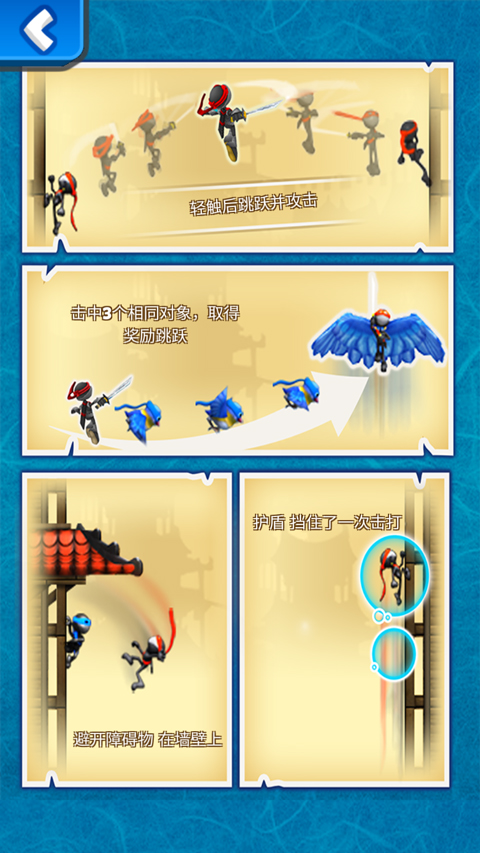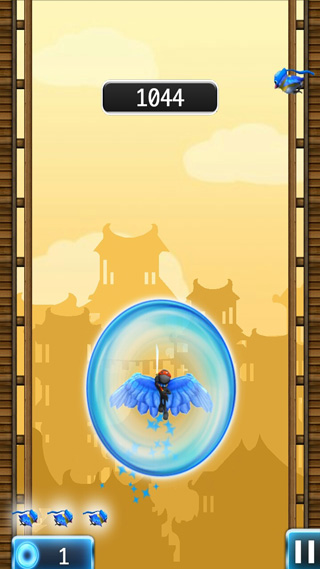 玩家打开游戏一眼可以看到这个画面,画面中有蓝色的小鸟,有拿刀的忍者,有锐利的飞刀,精美的图形会让玩家眼前一亮,激发起玩家对游戏的兴趣。