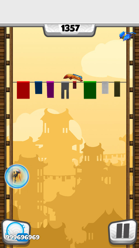 正式进入游戏后,会发现忍者跑的很快,时不时会看到有不同种类的小动物会在左右俩边墙壁穿梭,阻挡着忍着的去路,玩家看到它们可以朝它们碰过去点击屏幕就可以把它们消灭掉,从而爬的更高。