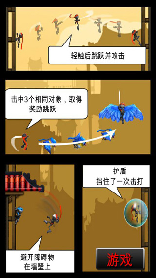 (2)玩家要尽量收集消灭的同种移动障碍物到3个,让忍者变换出不同形态,只有在特殊形态下加分才更快。
