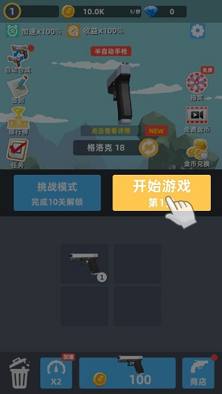 拇指枪王最新版是一款第一视角的休闲射击手游,开局一杆枪,瞄准、射击一气呵成,没有复杂的按钮操作,全程只凭一根手指便可轻松掌握,简单易上手,绝对是休闲娱乐的掌机必备。除了操作的简单性以外,放置挂机躺着就能领取收益,而且武器升级全靠合成来完成,等级越高收益越高,更何况游戏内还为玩家们精心设计了大量奖励系统,其中包括任务、签到、抽奖、免费金币、金币兑换等等。约计65种丰富的武器,不但威力惊人,而且收益高,别忘了进入商店特权,在提升挂机收益的同时,增加购买武器的折扣,争取用最小的投资换取最大的回报。