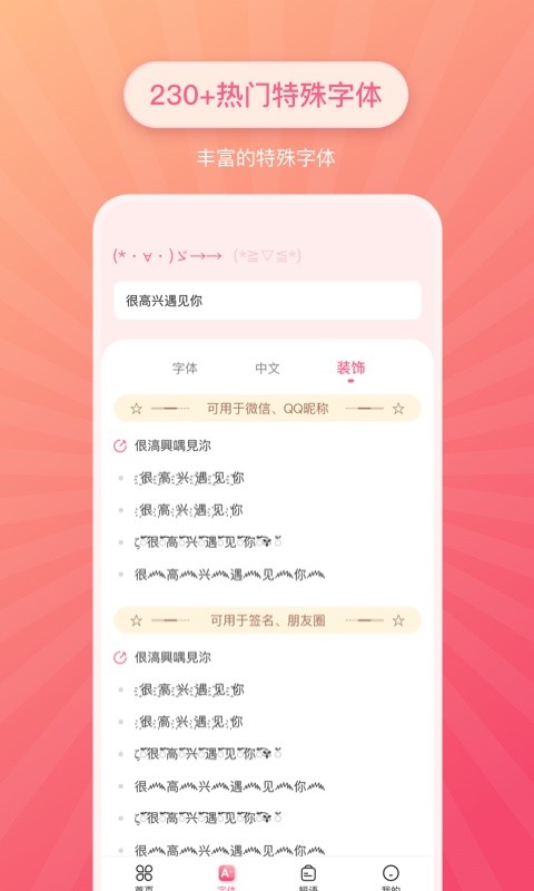 完全免费使用的特殊文字,特殊文字是一款集成了各式字体、颜文字符号的应用,您可以在应用中选择任意字体在社交平台上使用,超酷、超可爱、超个性的字体、颜文字和特殊符号,可以在任何app中使用!