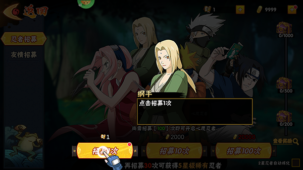 4、持续的登录奖励:游戏为玩家提供了丰富的登录奖励,如首日漩涡鸣人(九喇嘛)直升10星,次日直升11星,三日直升12星等。此外,还有每日的签到豪礼,玩家可以天天领取现金玉等丰厚奖励。