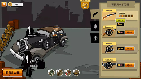 4、围绕车辆周围有许多可解锁的角色,通过闯关累积的金币可以增加队伍人数,同时还能升级武器。