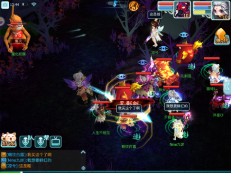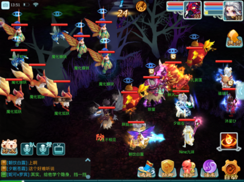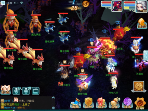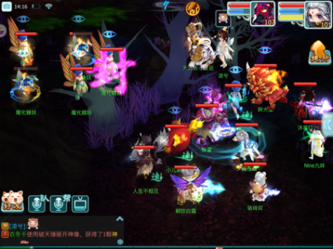 将小怪清理的差不多的时候,由于我们也是采取的点杀加群攻,主怪血量也一定是会有所下降,跟蝶妖一样,主怪会开始进行召唤,但是不同的是被召唤的小怪是可以被封印的。一旦开始召唤,我们就集火主目标,需要注意的是这个主目标很有意思。血量下降会出现三个不同的阶段,第一阶段会出现狂暴buff,当我们持续集火至半血,则狂暴buff消失,变成冷静状态,再集火至血量更低,则进入警戒状态。这个警戒其实就是主怪会为自己附加一个盾,承受的伤害下降。