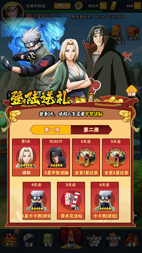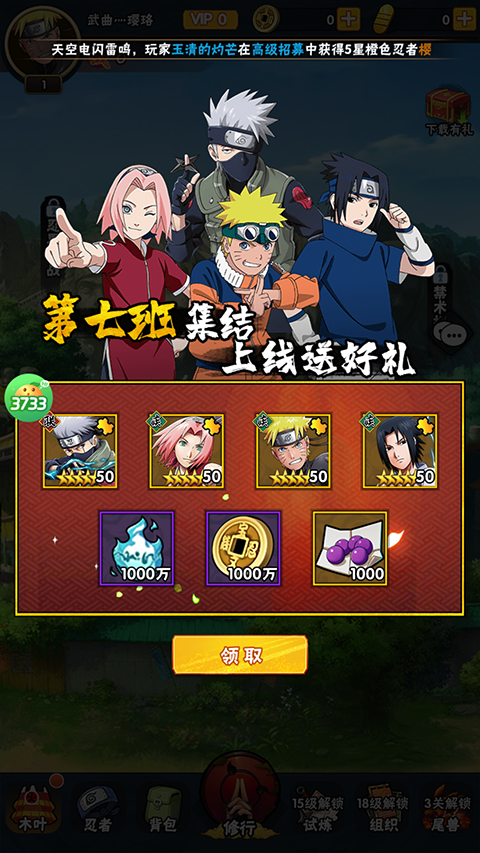2、上线送第七班礼包、忍者经验*1000W、铜钱*1000W、进阶丹*1000
