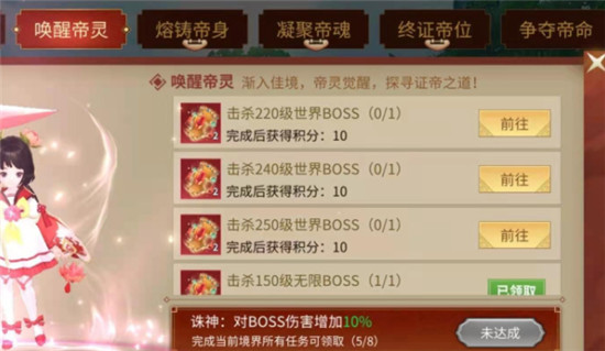 3、唤醒帝灵,挑战世界BOSS和无限BOSS,击杀指定级别的BOSS后任务即可完成。建议玩家战力达到推荐值后再去挑战。