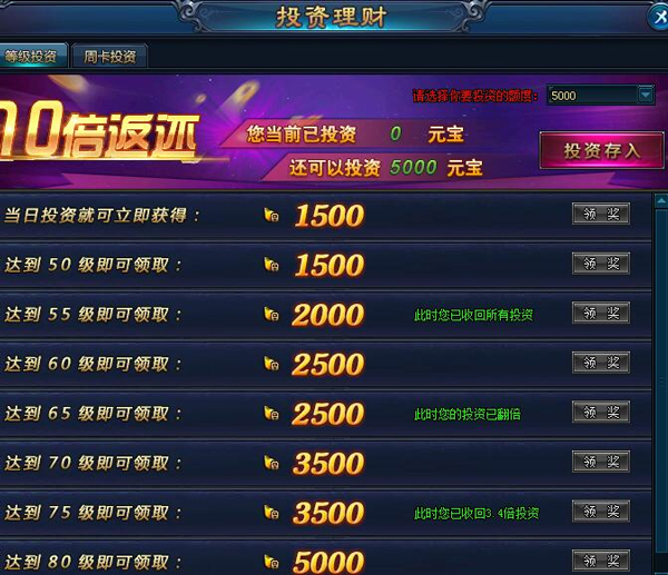 3、 除此之外,在商城中也可以购买进阶材料。当然需要消耗元宝的,不过参加【投资理财】活动5000元宝可以轻松获得22000元宝。这还只是80级的,后面85级5000元宝、90/95级6500元宝、100级10000元宝。