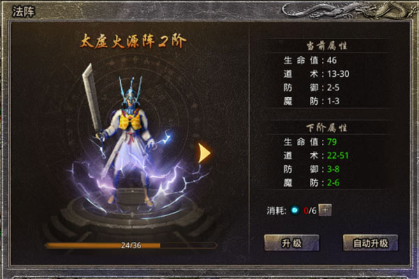1、法阵一共16阶等,可通过消耗阵法之灵来提升,每提升1阶都会获得多种属性提升