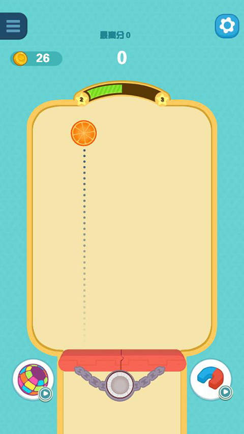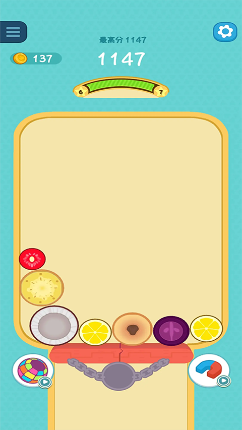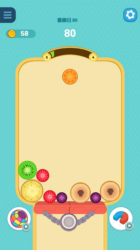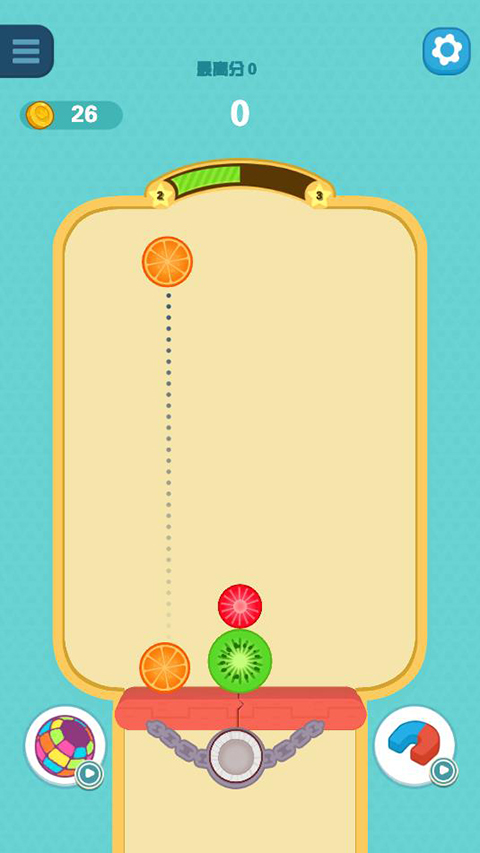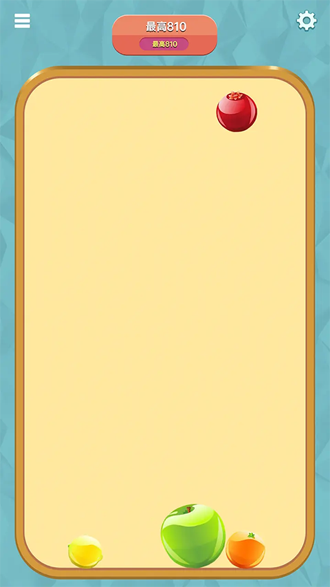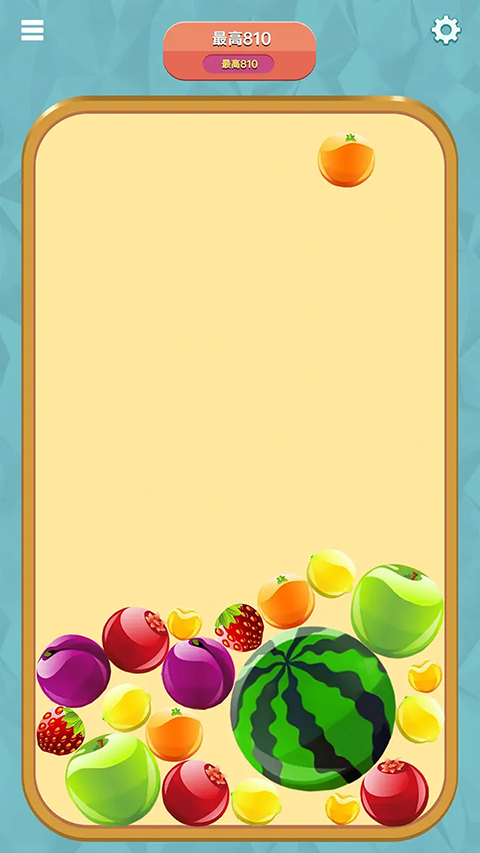 3、游戏比较简单,上手难度也不大,可将能合成的小水果放在一起,分清楚合成顺序,等待合成机会,不要随便乱放,乱放的话后面位置会越来越少,错过合成机会。