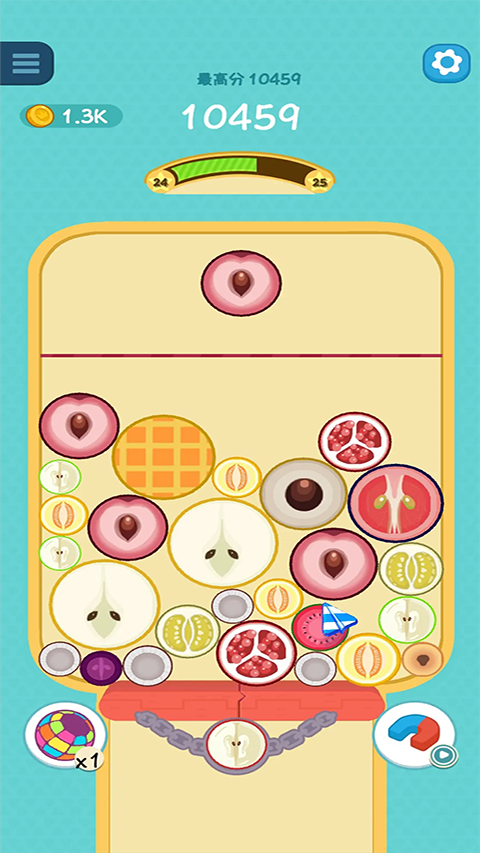 游戏的操作很简单:控制水果掉落的位置,两个相同水果可以合成新的水果,达到一定分数还能获得金币。此外,不同水果碰撞会有反弹效果,增加了一些挑战性。我觉得这个游戏特别适合休闲娱乐,尤其是果汁爆裂的效果和声音,真的很有解压感。