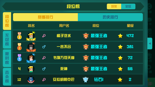 游戏还有段位系统,青铜到最强王者一共九个段位,每个段位都有不同的规则和挑战。虽然赛季结束会重置段位,但这也给玩家提供了不断进步的动力。