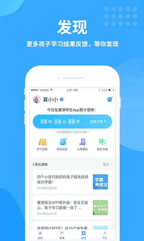动态为家长呈现孩子在翼课网上的学习过程和成果,让家长一起分享孩子进步的喜悦。