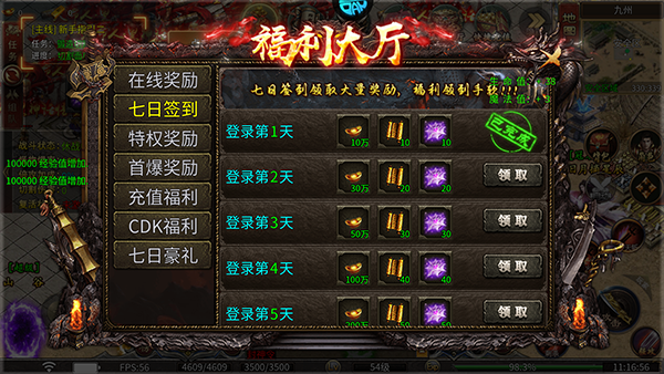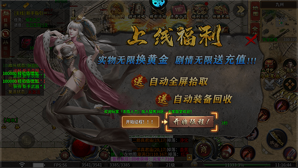 4、上线福利:上线就送自动拾取和自动装备回收功能。