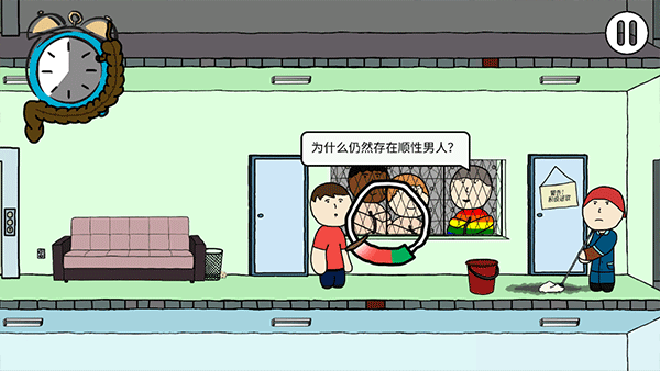 听起来挺无厘头的,但其实还挺考验策略的。你得观察场景里的道具和NPC(非玩家角色),有时候可能需要用点小聪明才能过关。比如在派对里,你可以假装跟别人聊天,然后悄悄溜走;或者在医院里,假装是医生去检查,就能避开其他人。