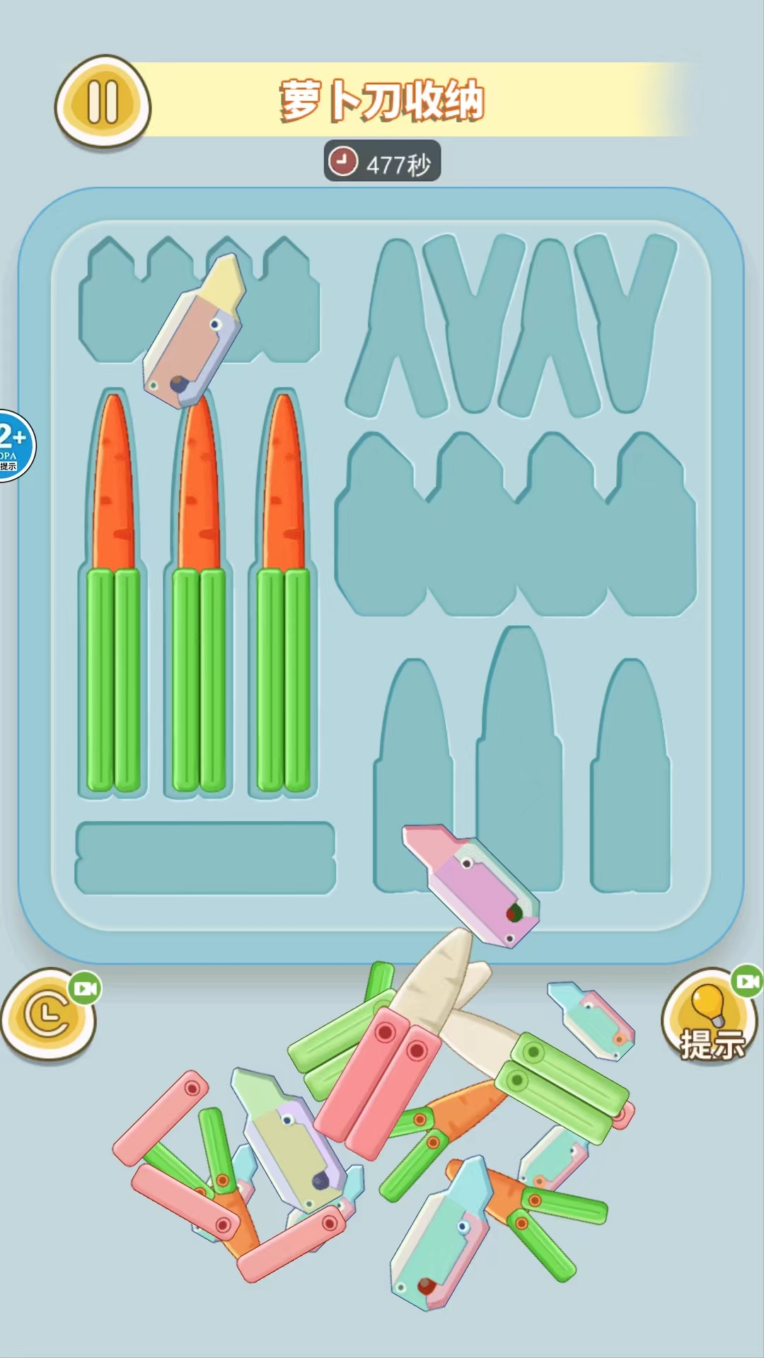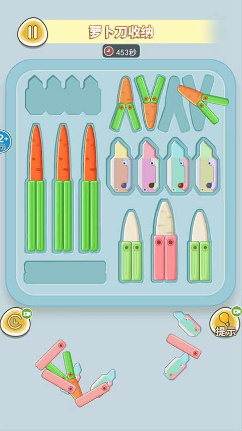 1、每个萝卜刀都有其独特的形状和大小,需要玩家根据其特点来合理地安排位置。
