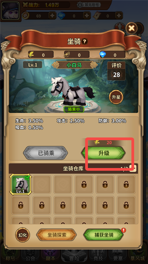 每个人可以骑乘一个坐骑,并获得该坐骑的所有属性。坐骑每次升级会获得固定比例的基础属性加成。