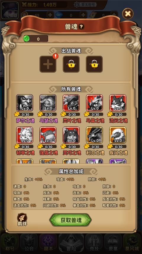 获取特定的兽魂并完成羁绊组合,可以提升属性加成;所有兽魂的属性加成会同时生效,无需上阵;兽魂升级会提升属性加成,每5级则会强化其技能效果。