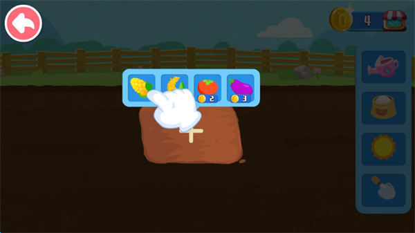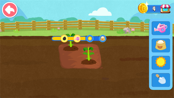 农田一片荒芜,宝宝拿起钉耙、开垦土地,再播撒玉米、小麦等种子。如何让种子快快长大?植物生长需要水分,宝宝点击洒水壶,开始浇水;如果想让它们长得又高又壮,还需要施肥。忙碌一番,再前往果园,种植苹果、椰子咯。