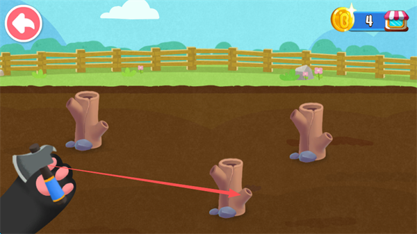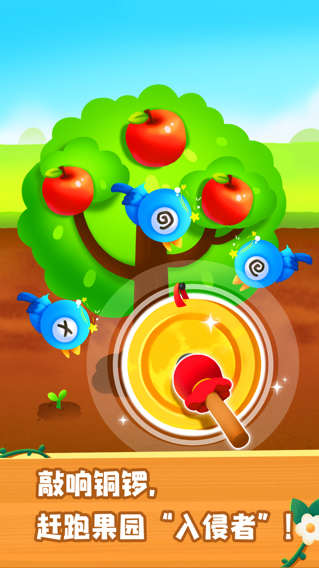 功夫不负有心人——果蔬顺利长大,结出了果实。不好,农田里出现“入侵者”,鸟雀和蝗虫正在偷吃果实!事不宜迟,宝宝快行动起来:举起杀虫剂,对准蝗虫进行喷洒;再使用木棍敲打铜锣,发出响声驱赶鸟雀。
