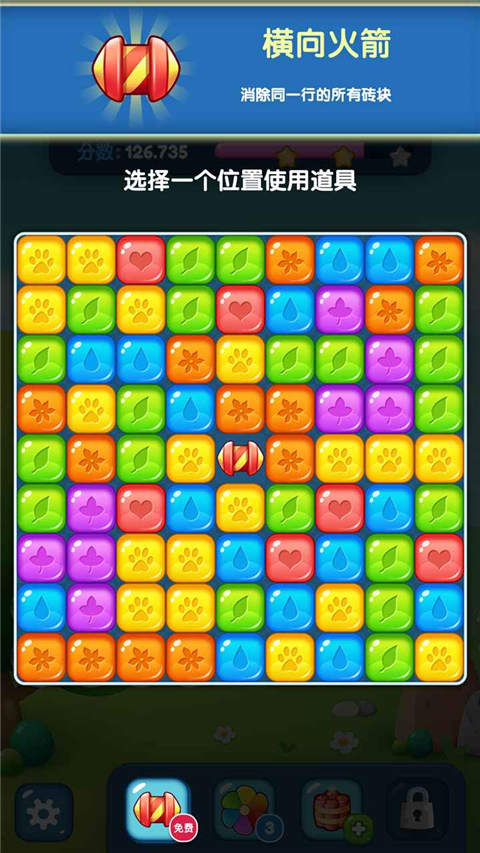 游戏中为玩家们提供了很多组合性质的道具,当我们五个方块同时消除会出现火箭,这个火箭可以瞬间消除一整排或者整列的方块,当然若是同时消除六个、七个、八个、九个也会出现更为高级的道具,这些都能帮助玩家们轻松完成任务。游戏加入多种消除组合道具,让玩家们的挑战变得更加轻松,也丰富了游戏的趣味性。