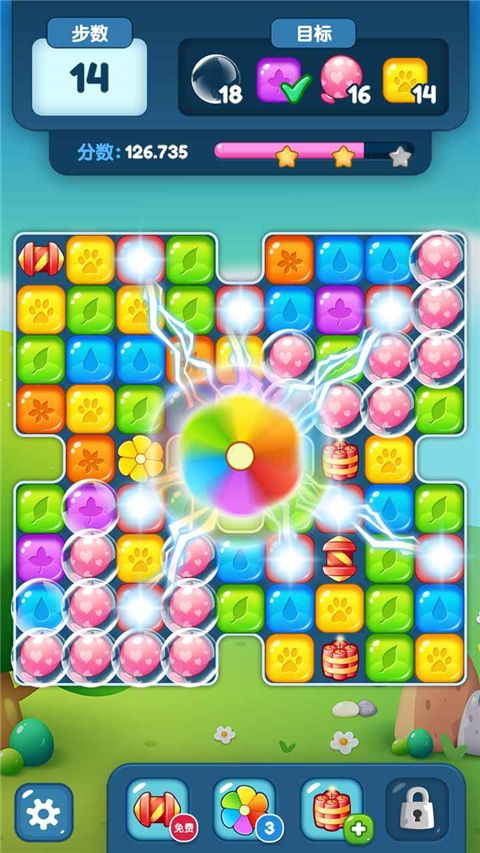 百变道具助力闯关,多重组合搭配,快乐冒险更有爱!来一发火药炸弹,全屏消除引爆华丽特效超快感!