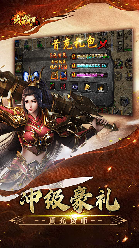 大战国是一款休闲传奇手游,上线就送自动回收、自动拾取、自动吃货币、大背包等,助力玩法飞速起步,即使是散人玩家也能追梦霸服。大战国传奇手游中有五大陆各主线剧情皆不同,所产出的装备也不同,玩家可前往不同地图打怪,获取掉落的专属装备。游戏内打怪不仅能掉落装备,还会掉落各种金币、砖石、元宝,玩家再也不用担心资源稀缺。传奇归来,风云再起,踏上成就王者的传奇之路!