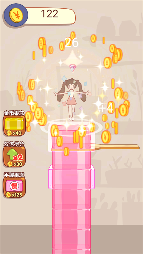 果冻女孩是一款休闲点击类游戏。操作简单易上手,各种玩法模式丰富多样。可以选择不同的角色游玩,还有各种好看的皮肤可以解锁。游戏中玩家控制女孩在果冻上进行旋转、跳跃,在果冻落下的那一瞬间间高高跳起,并稳稳的落在果冻上面即可。尽量让女孩跳到中间,因为这样你将可以获得更多的金币奖励哦!喜欢的玩家不妨下载体验一下试试看吧!